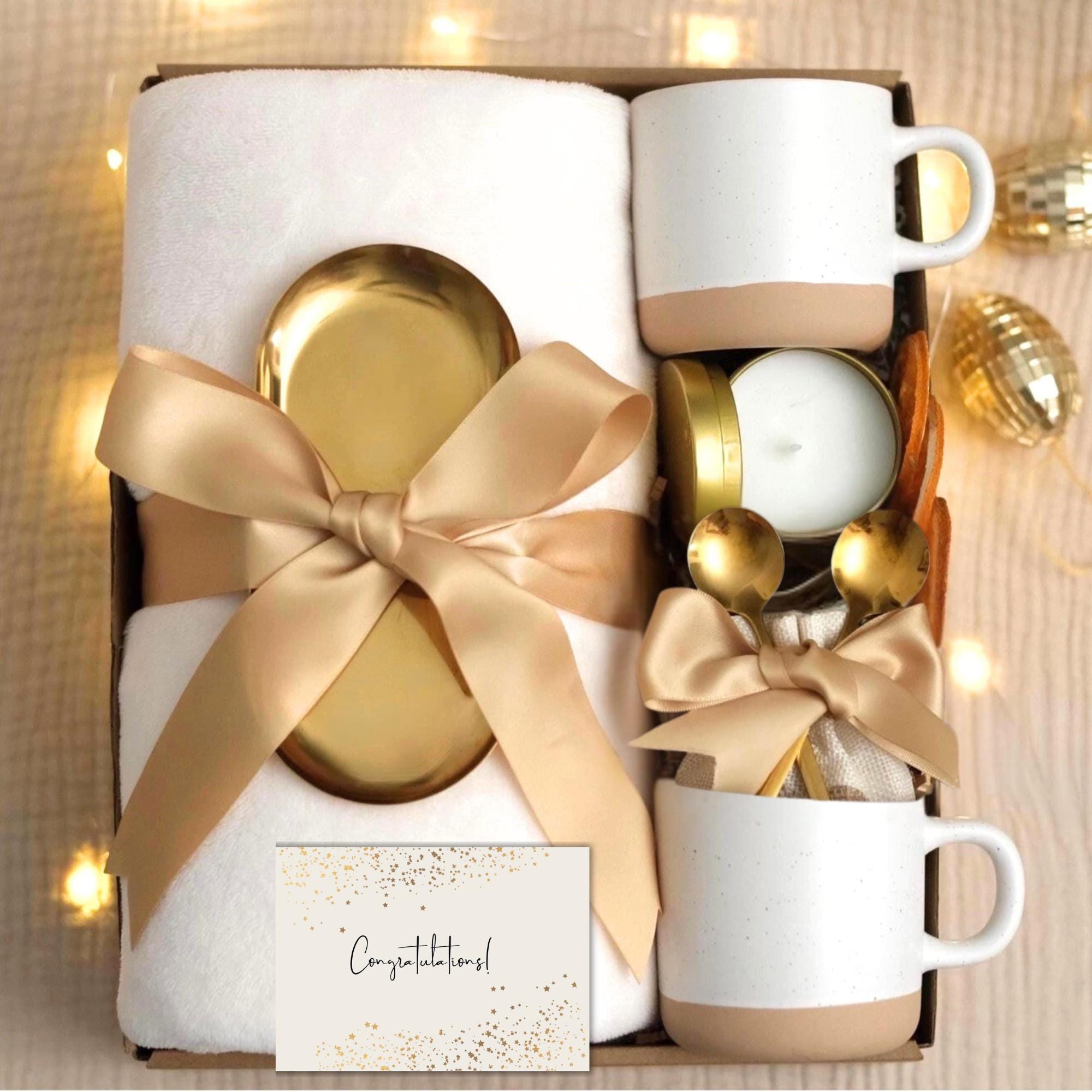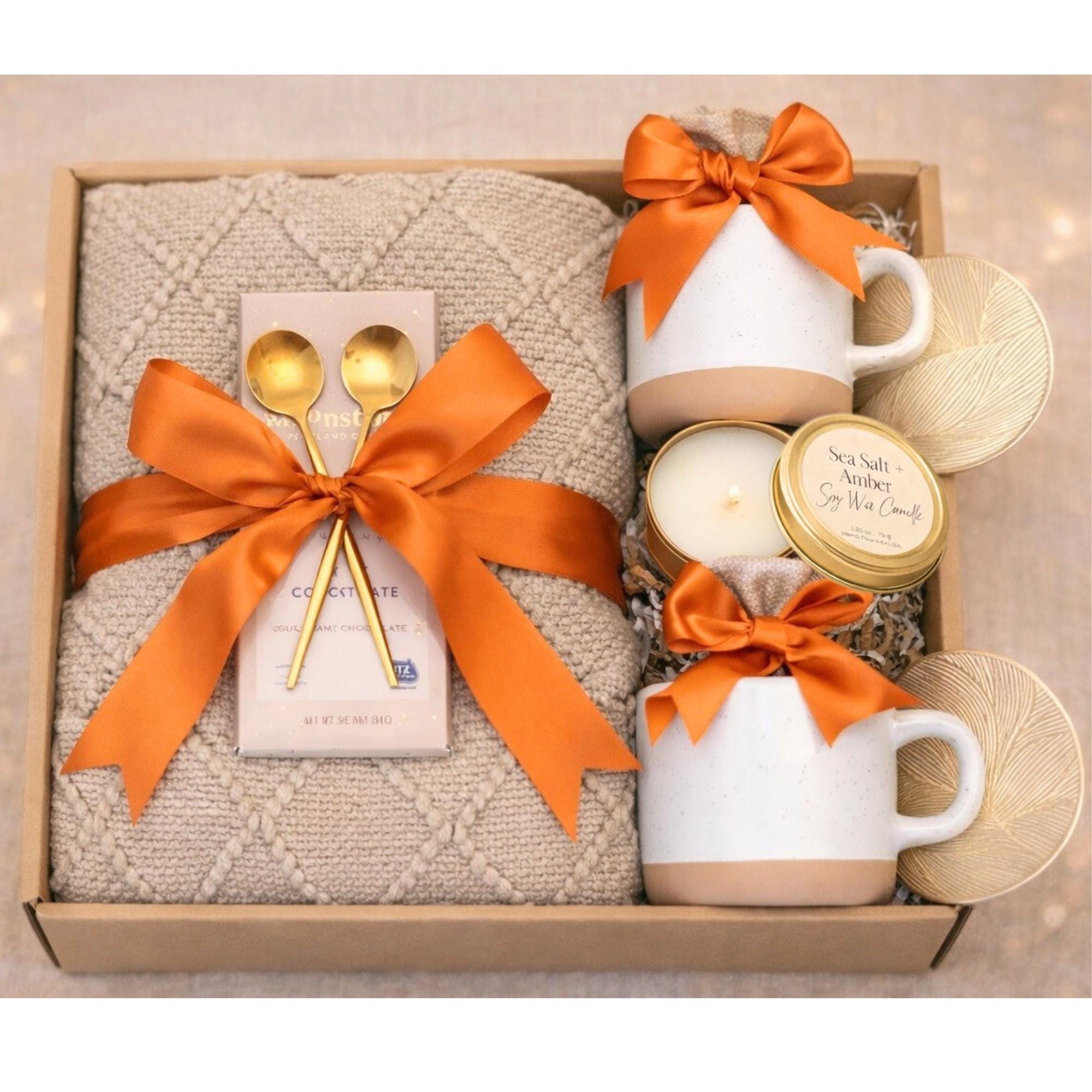 A luxury, ready-to-gift realtor closing gift box featuring cozy blankets, ceramic mugs, candle, chocolate, and elegant details.